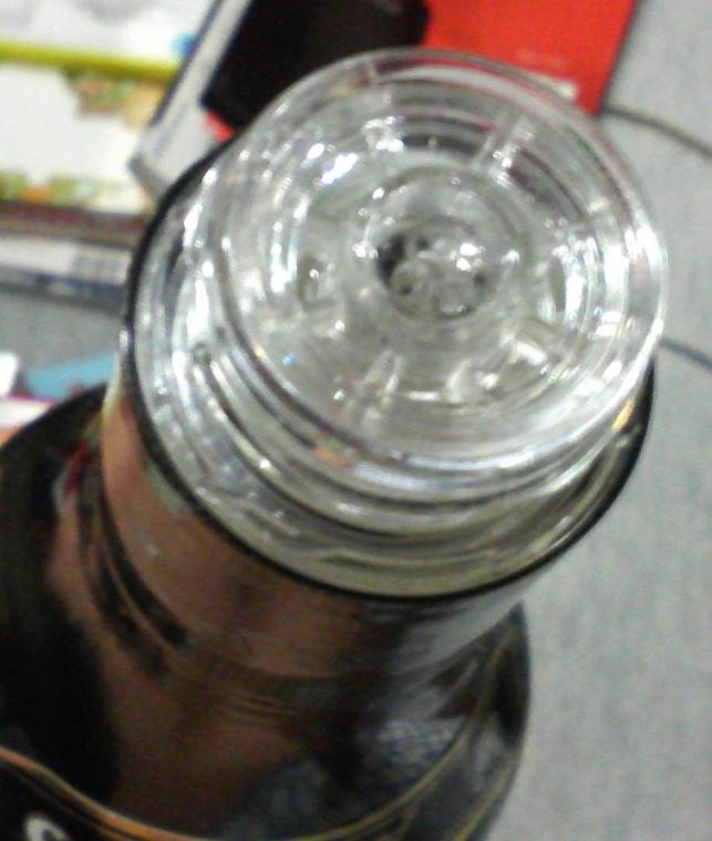 瓶自体が紙に包まれていて、上半分を破るとキャップが出てきます。