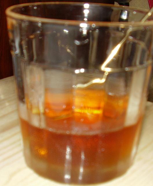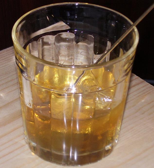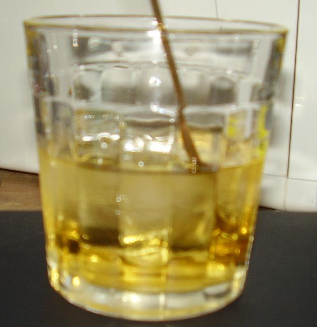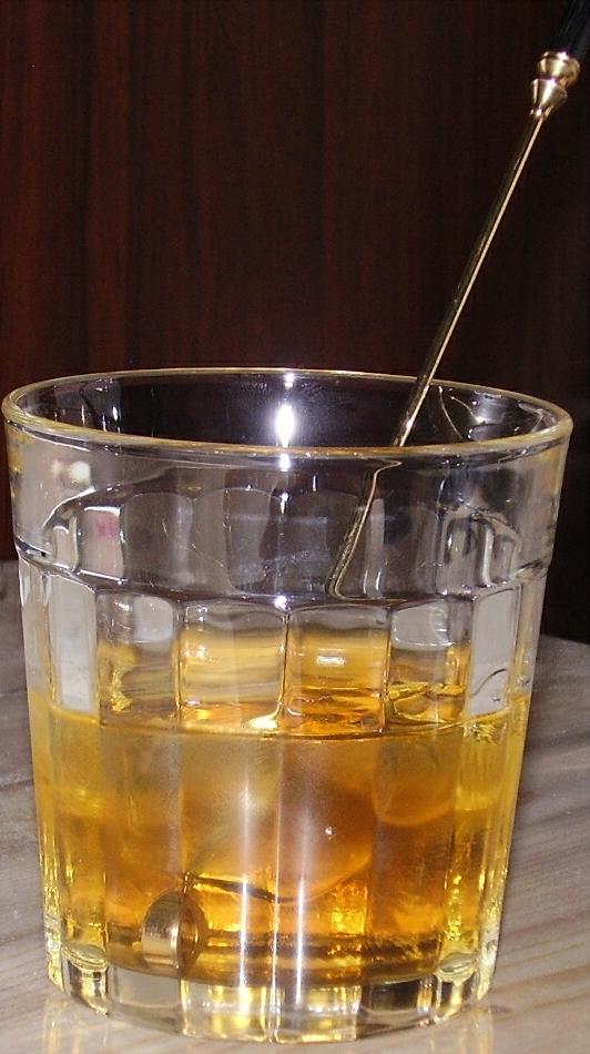 氷の入ったロックグラスへ、アクアビット30mlにドランブイ20mlを注ぎステア
